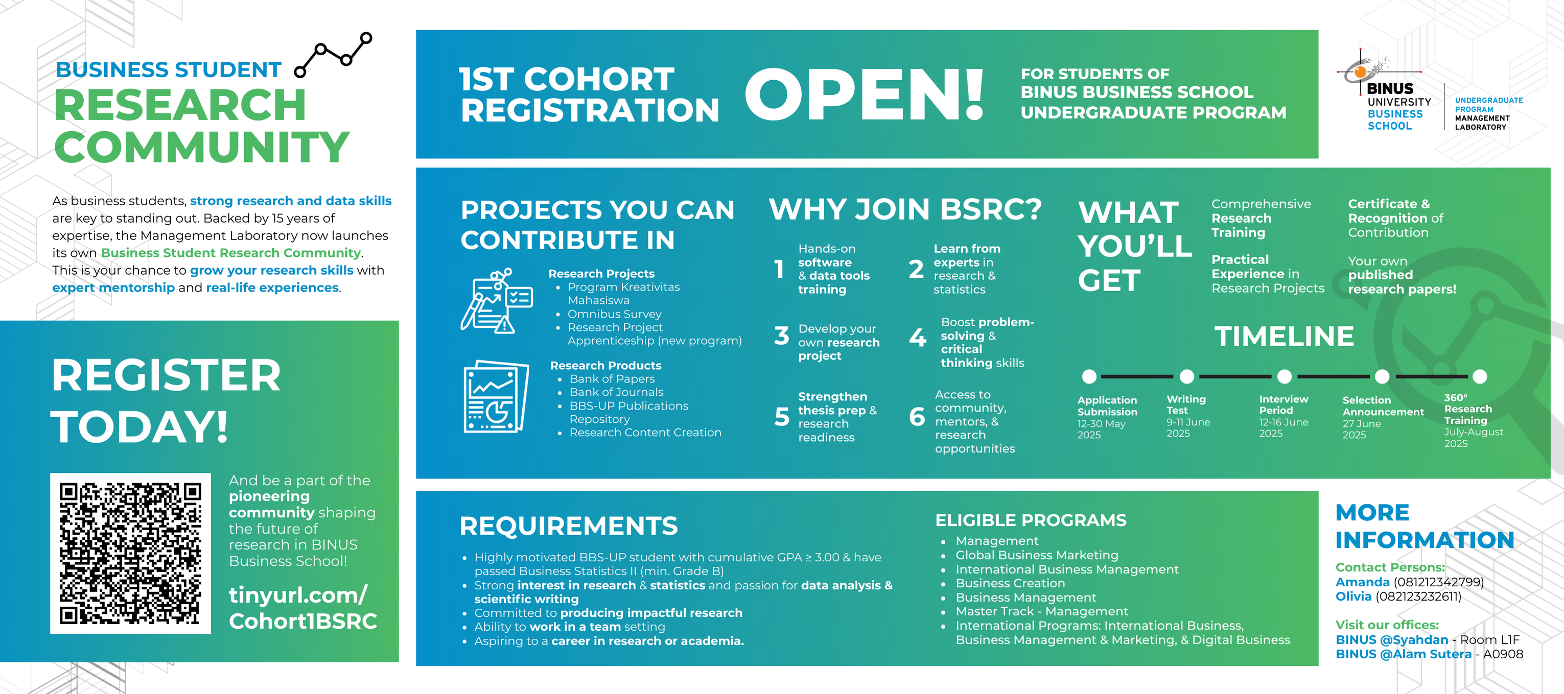 Be a part of the first-ever cohort of BSRC, the pioneering community shaping the future of research in BINUS Business School!