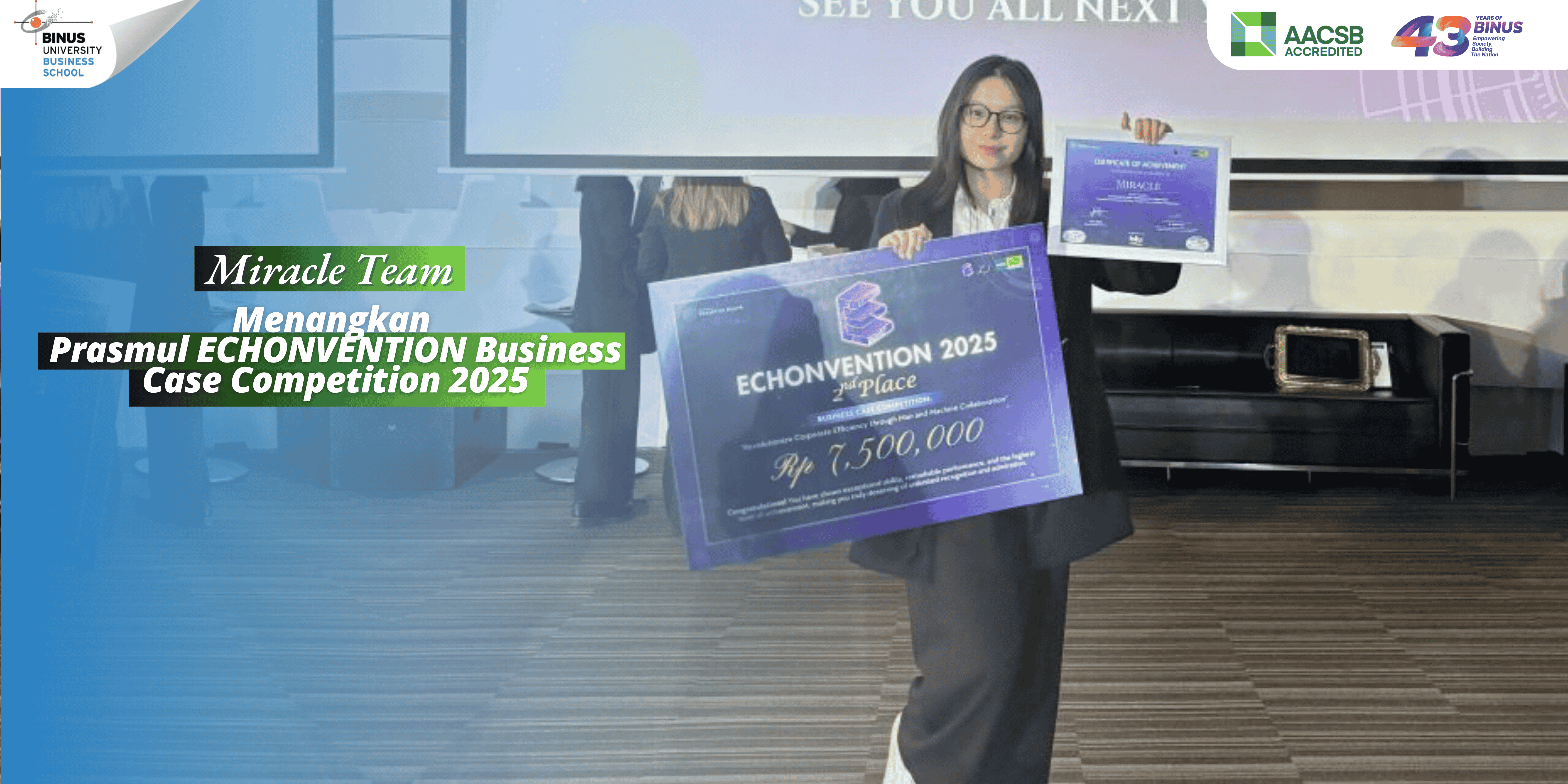 BINUS University proudly celebrates another national milestone as Team Miracle secured 2nd Place at the prestigious ECHONVENTION Business Case Competition 2025, hosted by Universitas Prasetiya Mulya. This recognition reflects the team’s strong analytical thinking, creativity, and passion in addressing real social and economic issues through innovative business solutions.