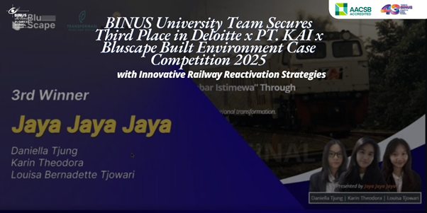 An a testament to their strategic insight and collaborative prowess, the team from BINUS University—Daniella Tjung, Karin Theodora, and Louisa Tjowari, presenting as “Jaya Jaya Jaya”—claimed third place in the Deloitte x PT. KAI x Bluscape Built Environment Case Competition 2025. Guided by coach Najah Najmia Halim, the team delivered a compelling presentation titled “The 3 Core Strategies for Building ‘Jabar Istimewa’ Through Sustainable Railway Reactivation.” Their approach integrated infrastructure, financing, and technology to drive long-term regional transformation in West Java, impressing judges with its alignment to national goals like Net Zero 2060 and inclusive economic growth.