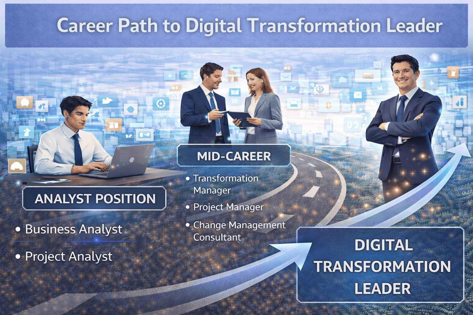 Graduates usually begin as Digital Transformation Analysts. In these roles, they support process redesign, system rollout, UX improvement, and change initiatives. They work closely with operations, IT, and business teams, learning how transformation actually happens on the ground. Over time, they gain the credibility and experience needed to lead multi-year, cross-functional transformation programs.