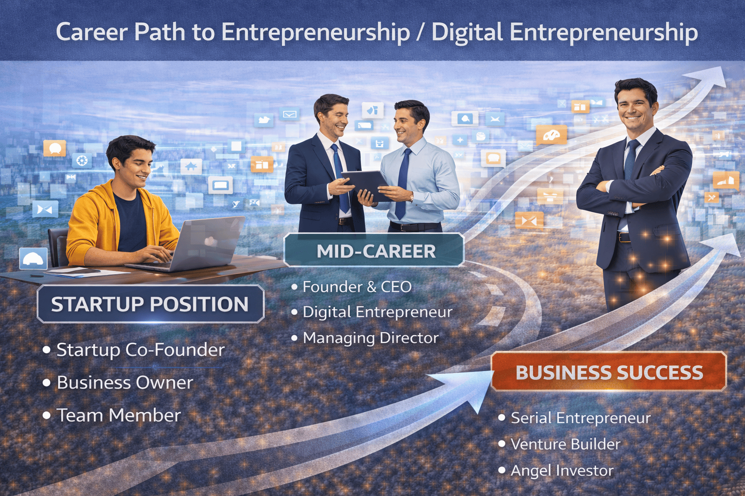 Graduates who choose the entrepreneurial pathway begin their careers by creating or joining early-stage ventures as startup co-founders, business owners, or entrepreneurial team members. At this stage, they focus on identifying real market problems, validating ideas, and building minimum viable products using digital tools and platforms. As their ventures grow, they progress into founders and digital entrepreneurs who manage operations, teams, partnerships, and financial sustainability. Over the long term, this pathway can lead to roles such as serial entrepreneur, founder and CEO, venture builder, or entrepreneurial leader who creates, scales, and invests in multiple businesses. Well-known examples include Nadiem Makarim, who built Gojek from a startup into a regional digital platform, and Jack Ma, who grew Alibaba Group into a global digital ecosystem.