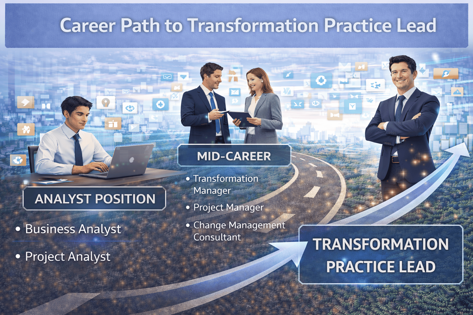 Consulting Partners lead strategy and transformation engagements across industries. These roles are common in global consulting firms such as McKinsey & Company and require strong analytical and leadership capabilities. Graduates begin as Junior Digital Business Consultants, supporting research, analytics, and transformation projects. Over time, they develop expertise, client trust, and leadership capability. This pathway fits your curriculum because it emphasizes structured thinking and real-world exposure. Research Methodology, Business Statistics, Analytics, Internship, Research, Entrepreneurship, and Community Development collectively prepare graduates for long-term consulting careers.