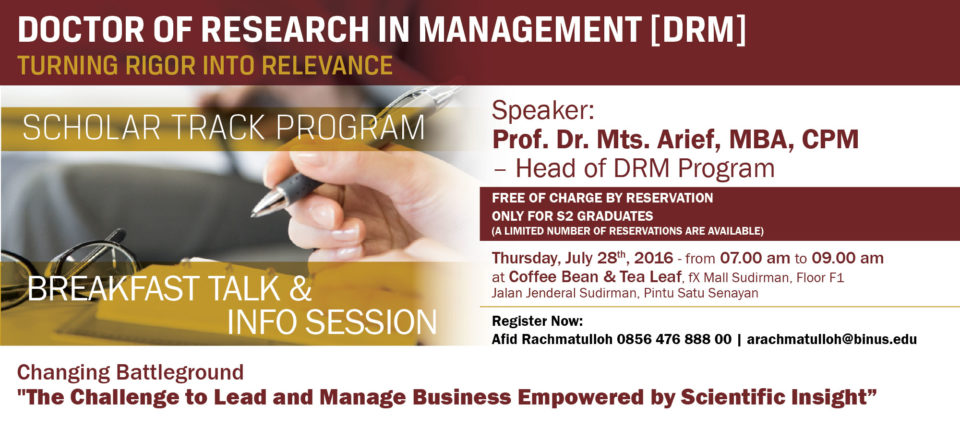 We are hoping you will take some time to come to the BINUS UNIVERSITY Doctor of Research in Management (DRM) Breakfast Talk and Info Session on July 28, 2016. Please register if you are planning to attend by emailing us. Please click: