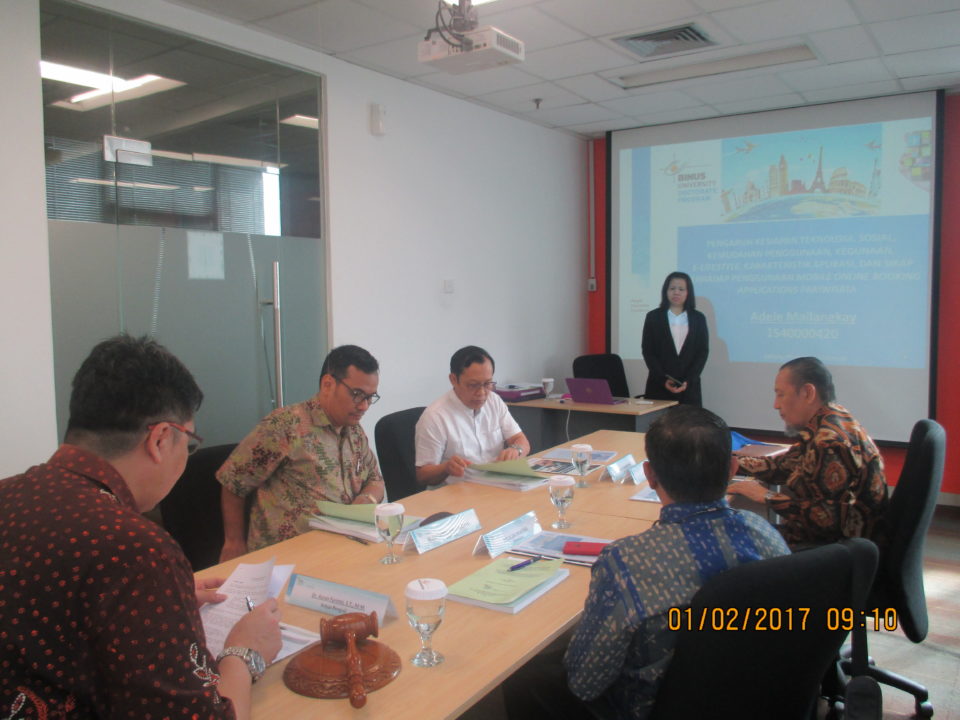 Jakarta, 1 Februari 2017 Pukul 09.00 telah diselenggarankan Ujian Proposal Disertasi mahasiswa DRM peminatan Business Information System Management atas nama ADELE BERNADET LINGKAN MAILANGKAY [1540000420] dengan judul disertasi ‘PENGARUH KESIAPAN TEKNOLOGI, SOSIAL, KEMUDAHAN PENGGUNAAN, KEGUNAAN, E-LIFESTYLE,KARAKTERISTIK APLIKASI, DAN SIKAP TERHADAP PENGGUNAAN MOBILE ONLINE BOOKING APPLICATIONS PARIWISATA” yang bertempat di Ruang Ujian & Perkuliahan BGP 809/B , Lantai 8, Kampus Anggrek