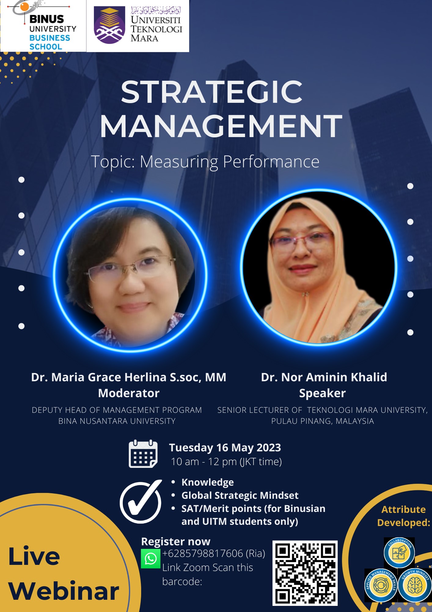 16 Mei 2023, Management BiNus mengadakan webinar Strategic Management dengan topik “Measuring Performance”. Kegiatan ini bekerjasama dengan Universiti Teknologi Mara, Penang, Malaysia yang dibawakan oleh Dr. Noor Aminin Khalid