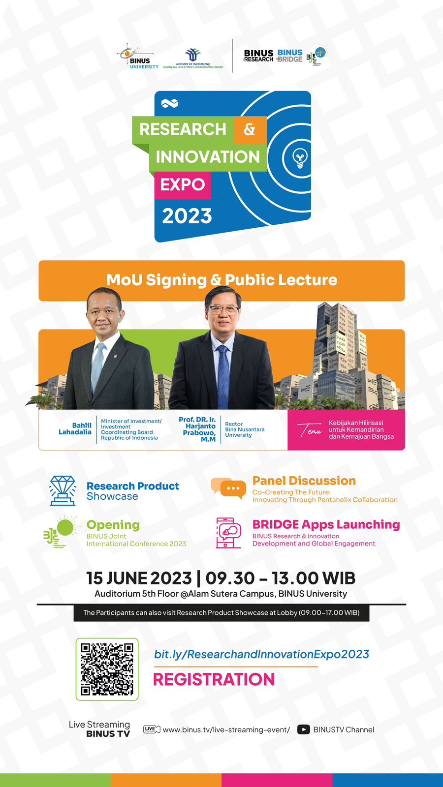 Join us in Research Innovation Expo 2023 with Prof. Dr. Ir. Harjanto Prabowo, M.M (Binus Rector) and Bapak Bahlil Lahadalia (Minister of Investment Coordinating Board Republic of Indonesia)