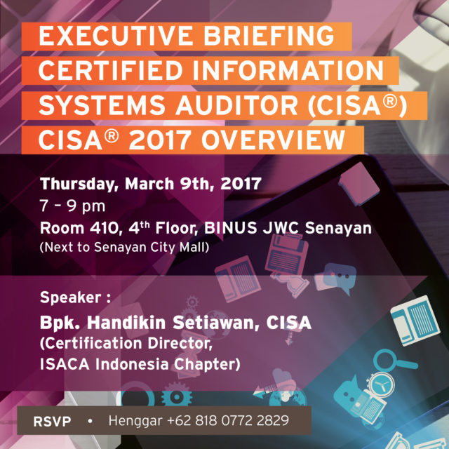 BINUS BUSINESS SCHOOL – Executive Education will hold the Executive Briefing Certified Information Systems Auditor (CISA®): CISA® 2017 Overview.