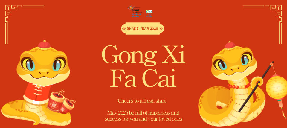 HomeSlideshowHappy Chinese New Year HomeFacultyHappy Chinese New Year Happy Chinese New Year 29 Jan 2025 Slideshow Binus Business School MM International wishes you a prosperous Snake year! Dr Dewi Tamara Share to your friends Cancel Reply